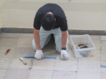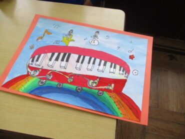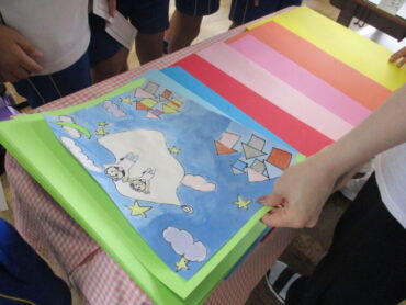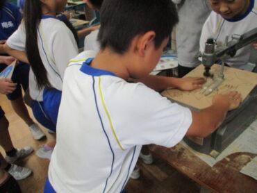 2025.9.18 3年生 5年生 学校の風景より 降雨のため、用務員は校舎内の修繕をしています。 階段の床の剥がれを丁寧に直していました。古い校舎を一生懸命に修繕してくれて、頼りになります。いつも本当にありがとうございます。 3年生図工の作品です。「ふしぎな乗り物」で、文房具等身近なものをモチーフに描いていました。 想像力豊かに、楽しい絵に仕上がっていました。どの絵も本当に素敵です。 5年生、図工で糸鋸を使用している様子です。 チームで教えたり助けたりしながら板を切っています。