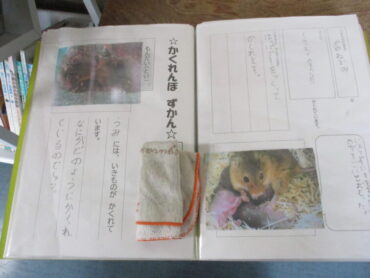 1年生は、国語で学習した説明文の書き方を生かして、「かくれんぼずかん」を書いています。