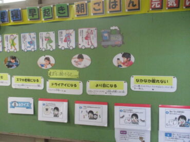 保健室前の掲示です。目を大切にしようということをクイズ形式で呼びかけています。