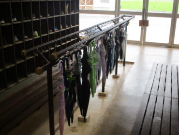 3年生の玄関の様子です。傘が破損しないように、きちんと束ねて傘かけにかけています。