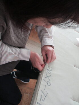 本校の教員が体育で使用するマットのほつれを繕っています。