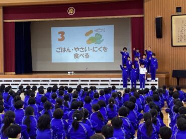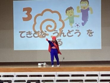 クイズ形式で、好き嫌いをせずご飯を食べること、午後10時から午前2時のゴールデンタイムに寝ること、しっかり体を動かすことが大事など食事・睡眠・運動の大切さがよく分かるように伝えていました。