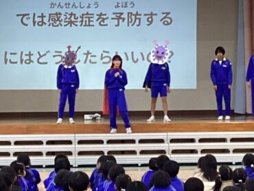 また、感染症を予防する方法について、病原体が体に入るのを防ぐこと、抵抗力を高めることが大切だと劇で発表しました。
