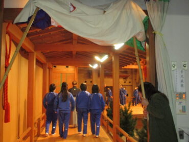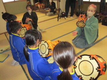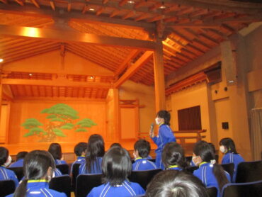 能舞台での能楽を鑑賞したあと、能舞台を歩いたり、お囃子楽器である大鼓、小鼓、太鼓をならしてみました。また、高砂を講師の先生と一緒にうたいました。