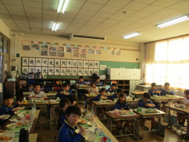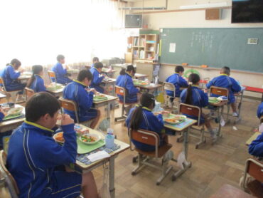 2025.12.18 全校生 給食の風景 今日の給食は、クリスマス献立でした。彩りよく美味しい給食を子供たちは満足そうに頬張り、一足お先に楽しい気分を味わうことができました。2学期の給食も、残すところ3回です。日頃から栄養バランスのよい食事に心がけて、元気な身体をつくりましょう。