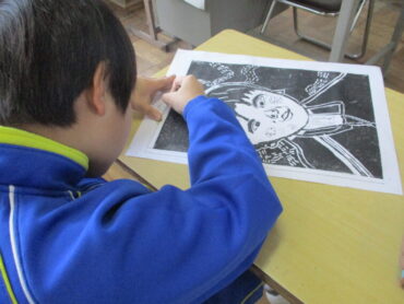 2026.1.30 4年生 4年生 版画に取り組んでいます 4年図工で木版画に取り組みました。テーマは自画像です。 彫りの方向が工夫されていて、とても表情豊かな作品に仕上がっています。 背景も個性的です。刷り方が上手ですばらしい作品に仕上がっていると思います。 ぜひ、学習参観でご覧ください。
