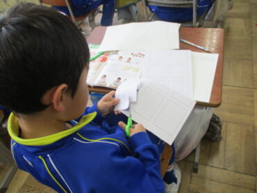 2年生算数の様子です。具体物をつくりながら集中して真剣に取り組んでいました。