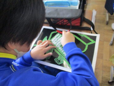 5年生図工ステンシル版画の様子です。器用に切り抜き着色しています。