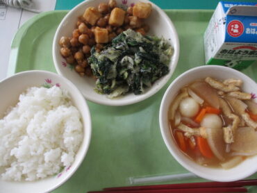 今日の給食は、地場産品献立でした。ご飯、牛乳、ひよこ豆の揚げがらめ、青菜の胡麻味噌、団子汁でした。からりと揚がった豆と高野豆腐が美味しかったです。団子汁は具沢山で、野菜をたっぷりいただけました。